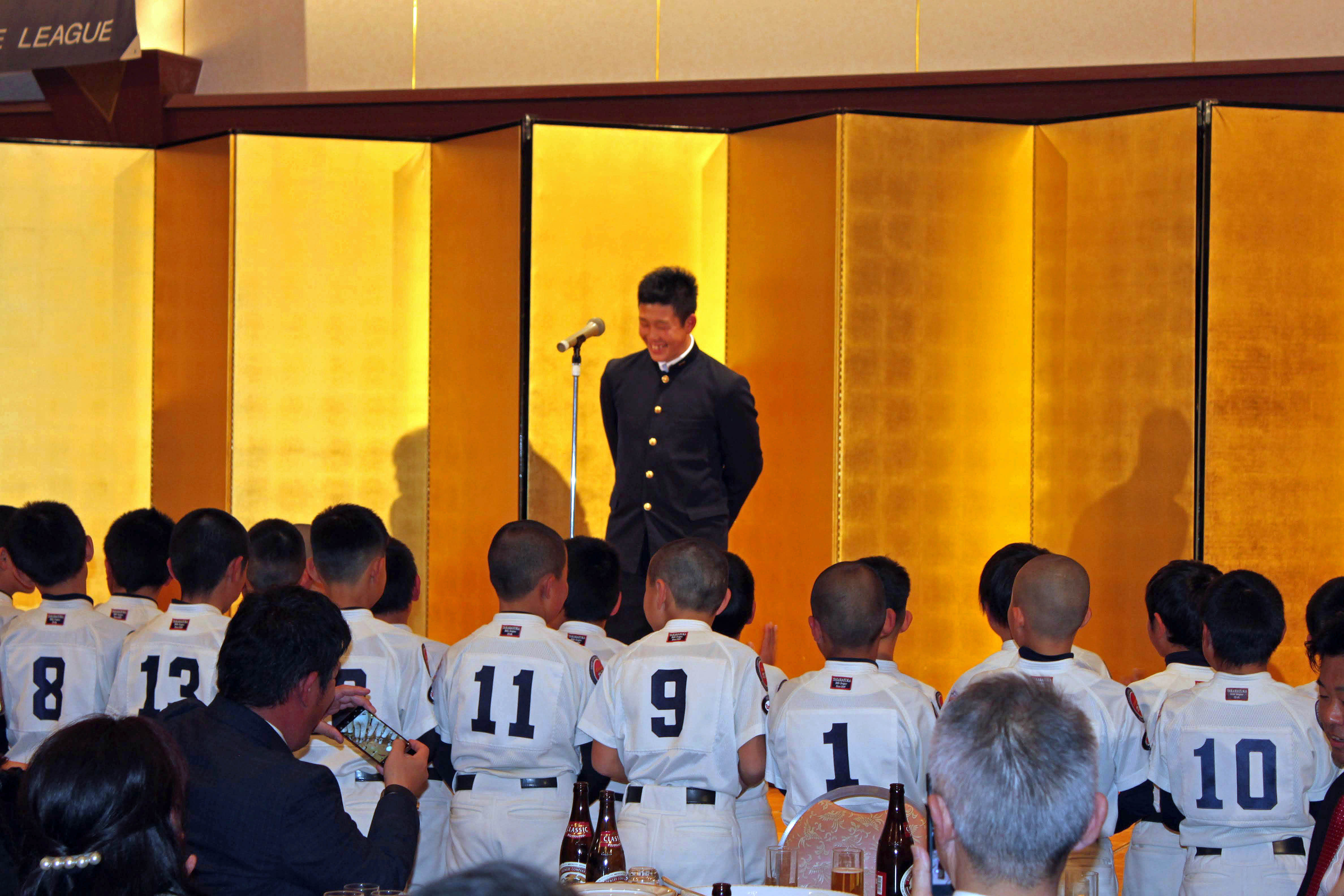 激励祝賀会は、小園選手へ現役リトルリーガーからの質問タイム、リトル時代の思い出映像鑑賞、司会の元フジテレビアナウンサー田中大貴さんがサプライズとしてヒーローインタビュー練習などで大いに盛り上がり、同じく宝塚リトルリーグOBで現在東京ヤクルトスワローズで活躍している山田哲人選手のお父様から挨拶を頂いたりと大盛会だった。