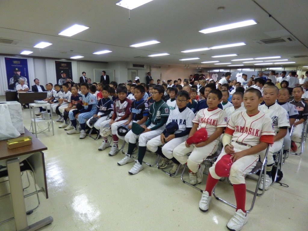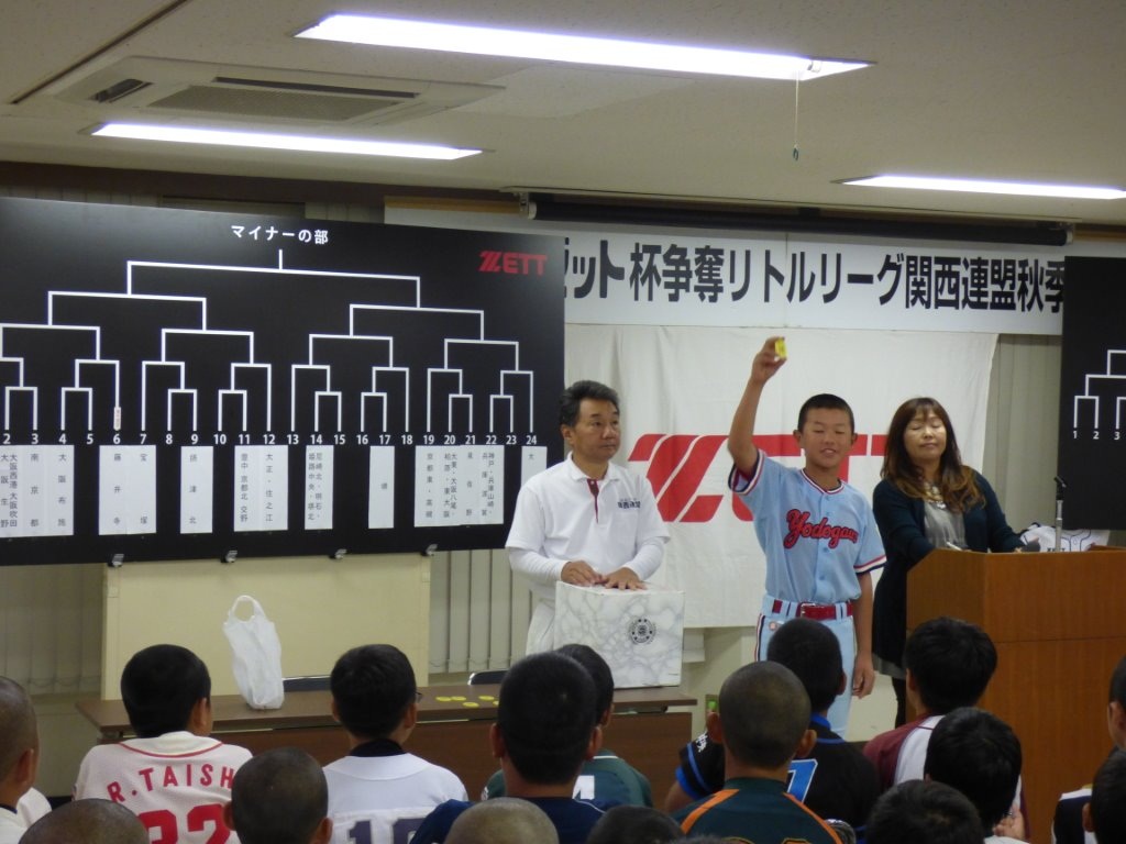 出場各チームのメジャー・マイナーの主将、監督、事務局長、連盟役員等の出席のもと抽選会が行われました。抽選に先立ち、溝端延彦リトルリーグ関西連盟理事長の挨拶の中で、30回の長きに亘り大会協賛をいただいているゼット株式会社様への謝意が述べられ、大会協賛ゼット株式会社ベースボール事業部事業部長 長谷川 正様からもご挨拶をいただきました。