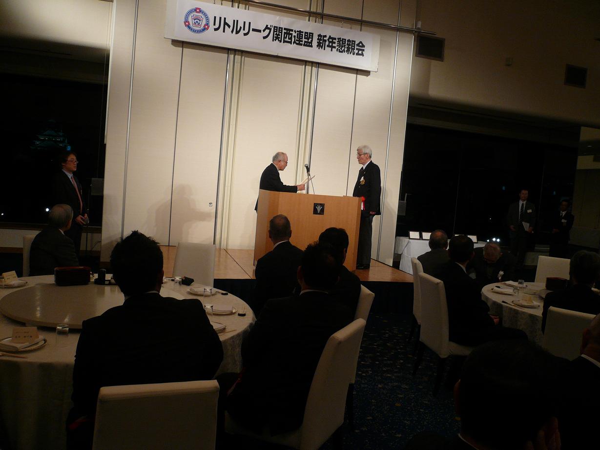 リトルリーグ関西連盟に、ご後援、ご協賛、ご協力を頂いています関係者のご臨席のもと、開催されました。先立って、溝端 延彦理事長より、前関西連盟事務局長 藤原 紀元様に感謝状・記念品贈呈に続き、功労者5名の表彰が行われました。