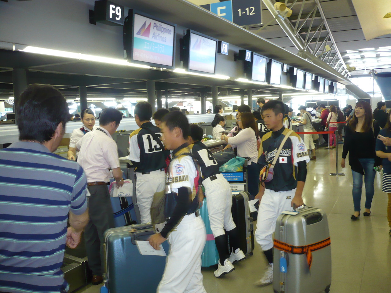 日本代表としてアジア・パシフィックの王者、更には世界一を目指して泉佐野リーグインターミディエットチームが決戦の地、フィリピンに向け6月30日に地元関西空港から元気に出発をしました。選手団は溝端関西連盟理事長、北谷リーグ会長などの見送りを受け出発、マニラ到着後パトカーの先導で宿舎、球場のあるクラークに到着し歓迎を受けました。7月1日は開会式の後、早速グアム代表との試合に臨みます。写真は空港ロビーでの記念撮影、チェックイン風景、マニラ到着後のスナップ