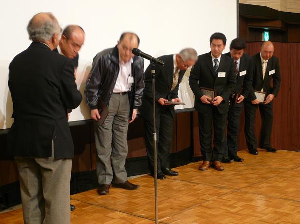 楠見三郎関西連盟会長の乾杯の音頭で宴会のスタート。中座において関西連盟理事長より、矢倉達夫前会長に(代理受領)に感謝状が贈呈され、また、各リーグより推薦されました永年功労者表彰状が8名(2名欠席)に贈呈されました。宴会最後に川上義弘関西連盟副理事長の発声「がんばろう」の全員三唱で以て新年懇親会が終了いたしました。